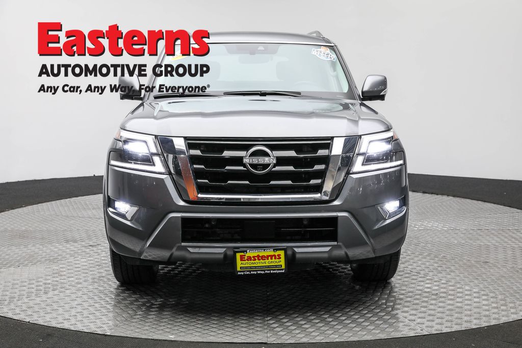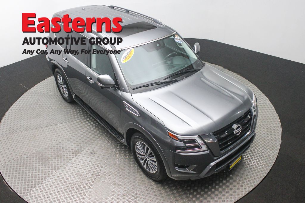 2023 Nissan Armada SL Gun Metallic RWD 7-Speed Automatic 2nd Row Captain's Chairs, 2nd Row Center Console w/Padded Armrest, 3rd Row Carpeted Floor Mats - Captain Seat, Auto-dimming door mirrors, Auto-dimming Rear-View mirror, Auto-leveling suspension, Automatic temperature control, Bose 13-Speaker Premium Audio System, Brake assist, Captain's Chairs Package, Exterior Parking Camera Rear, Front dual zone A/C, Front fog lights, Garage door transmitter: HomeLink, Heated door mirrors, Heated Front Bucket Seats, Heated steering wheel, Leather-Appointed Seat Trim, Low tire pressure warning, Memory seat, NissanConnect featuring Apple CarPlay and Android Auto, Power door mirrors, Power driver seat, Power Liftgate, Power moonroof, Power passenger seat, Radio: NissanConnect w/SiriusXM, Rear air conditioning, Rear window defroster, Rear window wiper, Reclining 3rd row seat, Remote keyless entry, Speed control, Split folding rear seat, Steering wheel memory, Traction control, Wheels: 20" x 8J Painted Alloy.